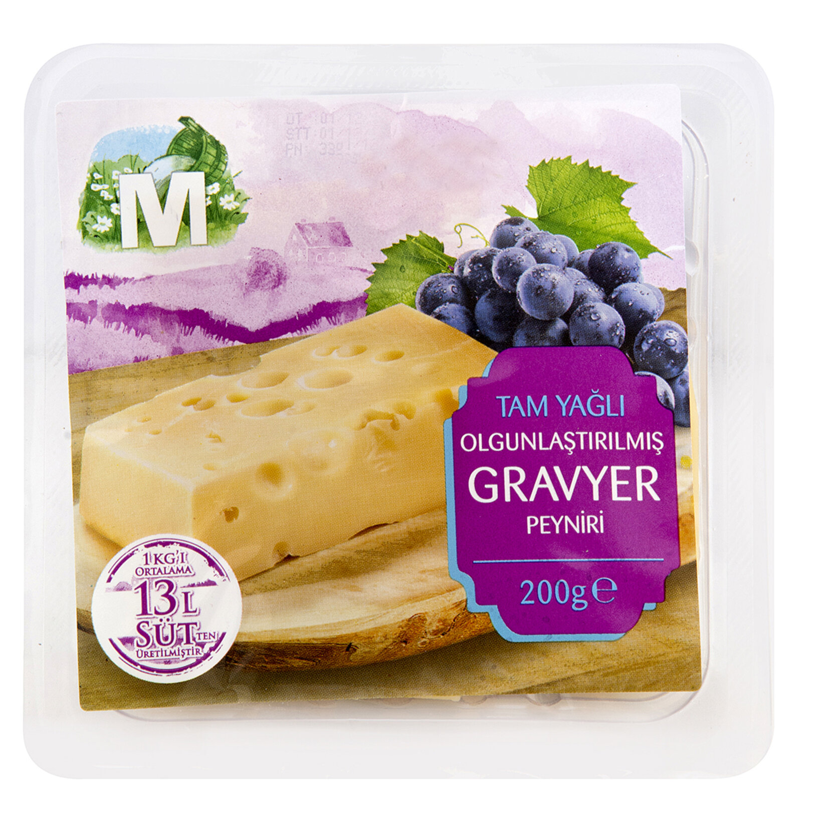 Migros gravyer peyniri, Kars'ın yöresel zenginliklerini sofralarınıza getiriyor. 20. yy'ın başlarından bu yana Türkiye'de Kars ve Ardahan'da üretilen gravyer peyniri inek sütünden elde ediliyor. 1 kilogramı ortalama 13 litre inek sütünden elde edilen Migros Grayver Peyniri, sert ve dağılmayan yapısıyla gurmelerin tercihi oluyor.
